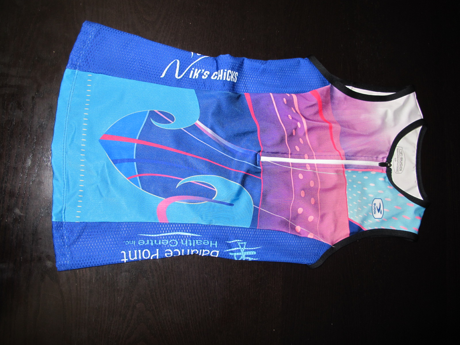 Tri Shirts: Do you have the perfect top for your first triathlon?! If not – consider a custom made Nik’s Chicks tri shirt!! You can take one home to try one on if you wish. Total cost will be 52.00 each, taxes in (similar styles sell for 70.00 – 90.00). I have 2 smalls, 3 mediums, 1 large and 1 x-larges in stock). If you have gotten a shirt from me to try and it works, please drop by a chequeor cash for 52.00. We wear these shirts under our wetsuits on race day. They fit snug (no chaffing) and have pockets on the back to hold gels/lip balm!