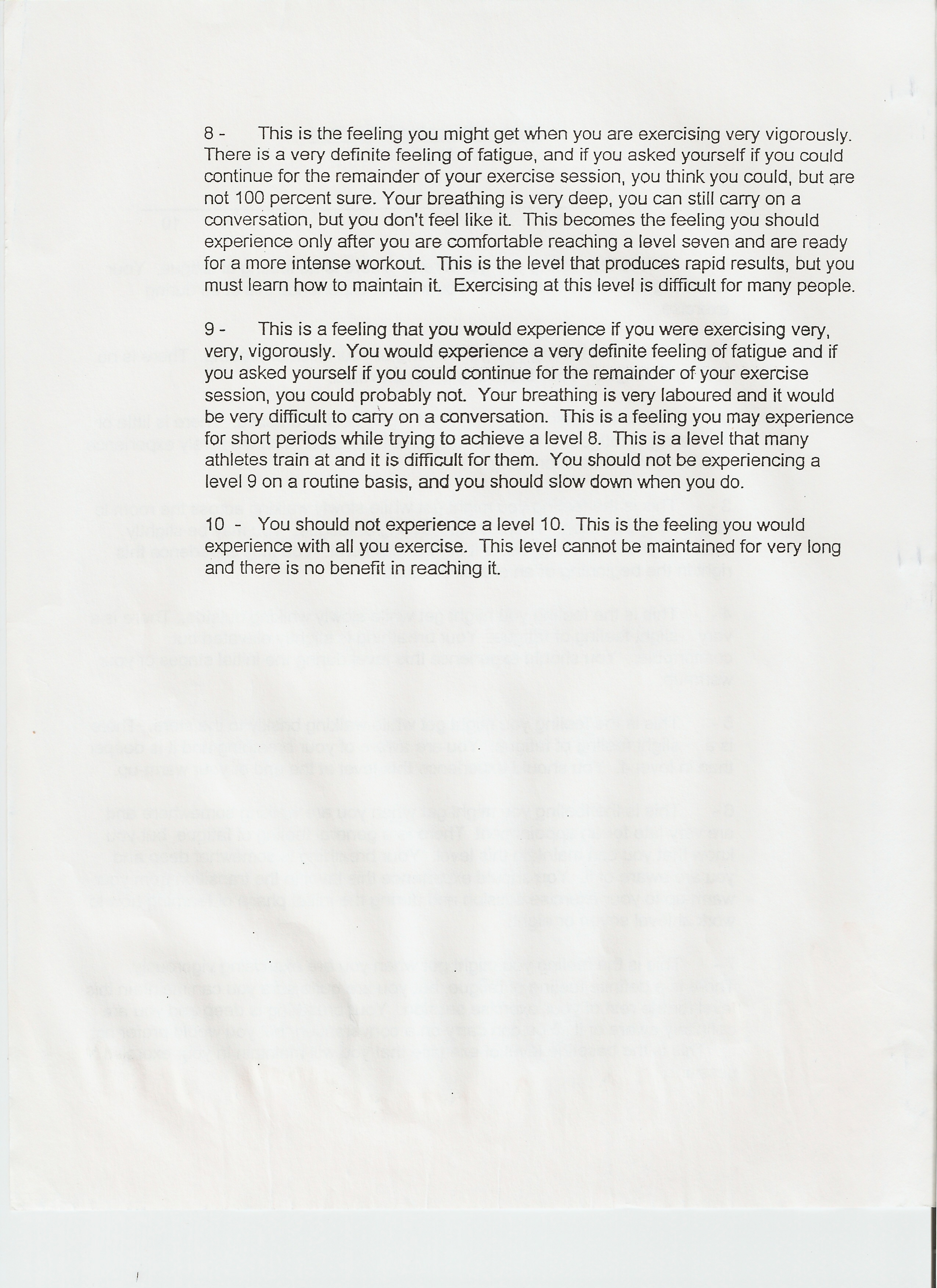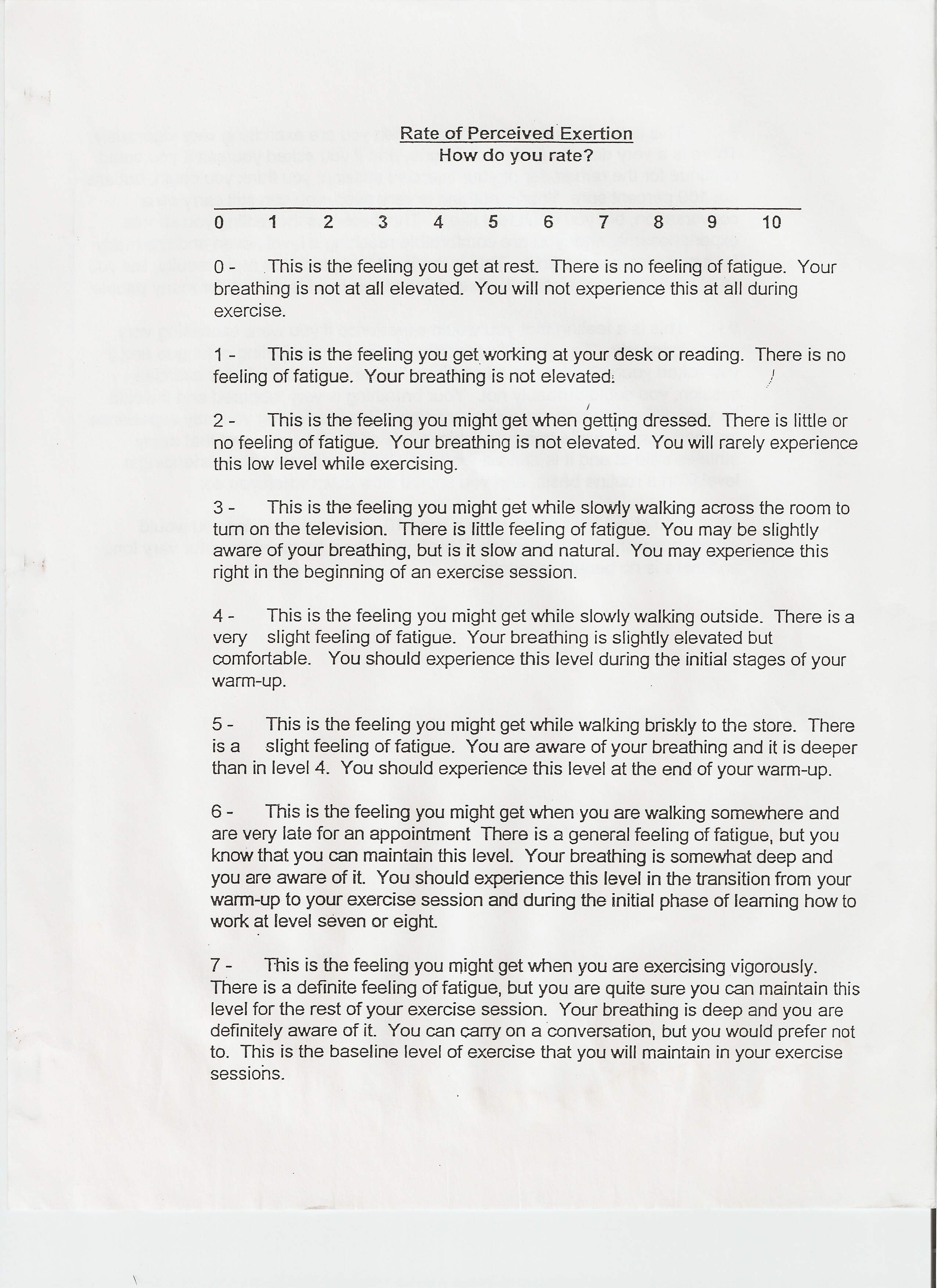 RPE: Rate of Perceived Exertion (RPE) can be used to help you determine how hard you are working. During your running intervals, you should be between a 7 and 8.5. Use the walk breaks for recovery. Your breathing should regulate and you should feel ready to go into the next interval. Here is a copy of the scale I used to use with my personal training clients. Where are you during your running intervals?