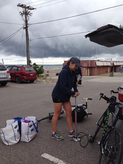 Wasaga Beach Triathlon Race Report: Well, we woke up relaxed and ready to race. After an easy breakfast we picked up Karin and head to the race to pop our bikes into transition. Upon our arrival, one look at the dark clouds and high surf (5-7ft swells) had us worried! Our original plan was to have a drive around the bike course. This was interrupted by Jo’s tire which decided to pop as we were doing a last minute pump up!