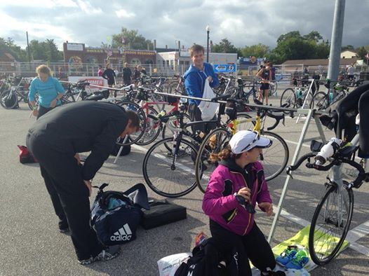 We got it fixed pretty quick, put our gear into transition, were body marked and got our bib numbers. We decided not to give up our parking spot and didn’t drive the bike route – checked out the map instead. Karin got her clothing situation sorted away and Tony & Martin provided comic relief!